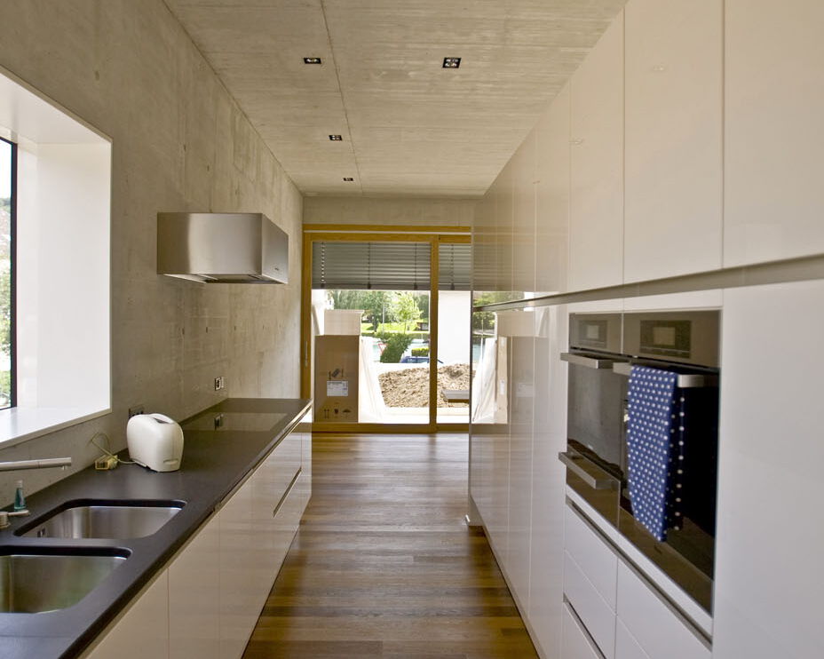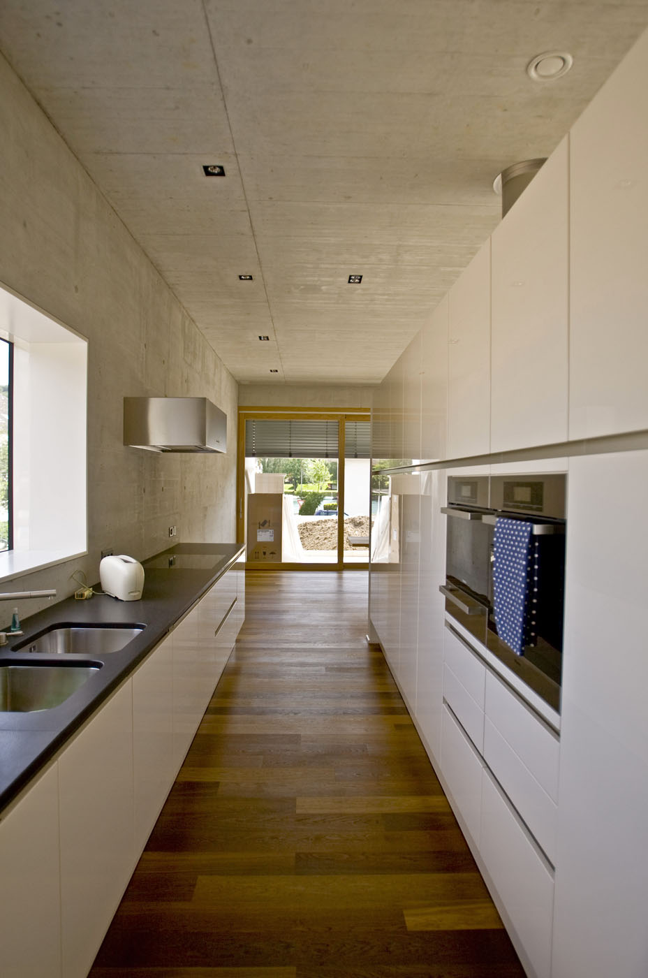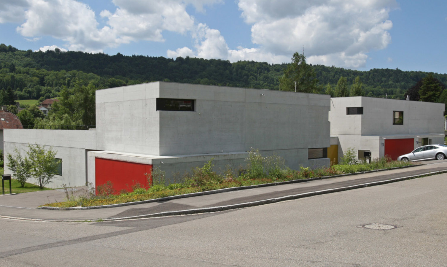 Die Gebäudehülle besteht aus einem monolithischen Isolationsbeton, Innen wie Aussen in Sichtqualität. Hochwertige Materialien im Ausbau schaffen einen exklusiven Charakter.