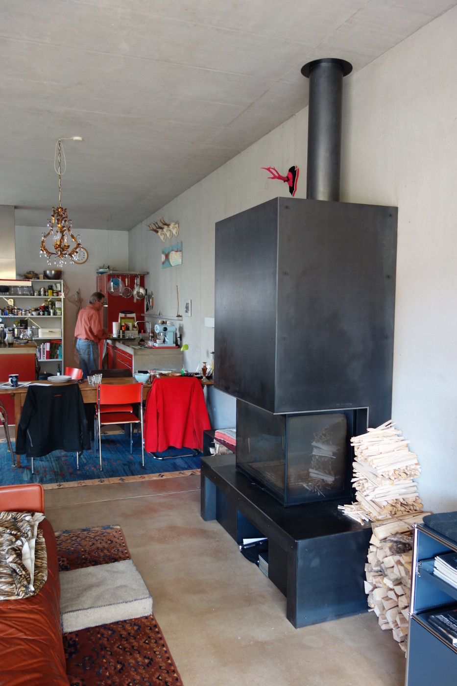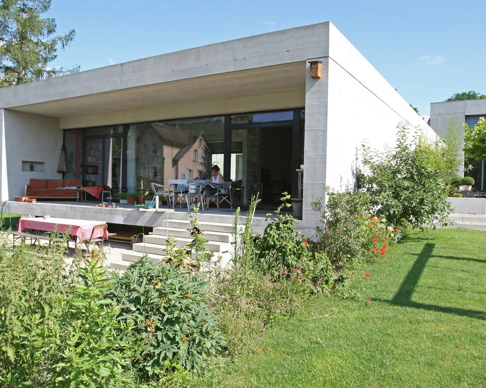 Die Gebäudehülle besteht aus einem monolithischen Isolationsbeton, Innen wie Aussen in Sichtqualität. Der loftartige Charakter wird durch einen offenen Atelierraum und einen fugenlosen Sichtestrich verstärkt.