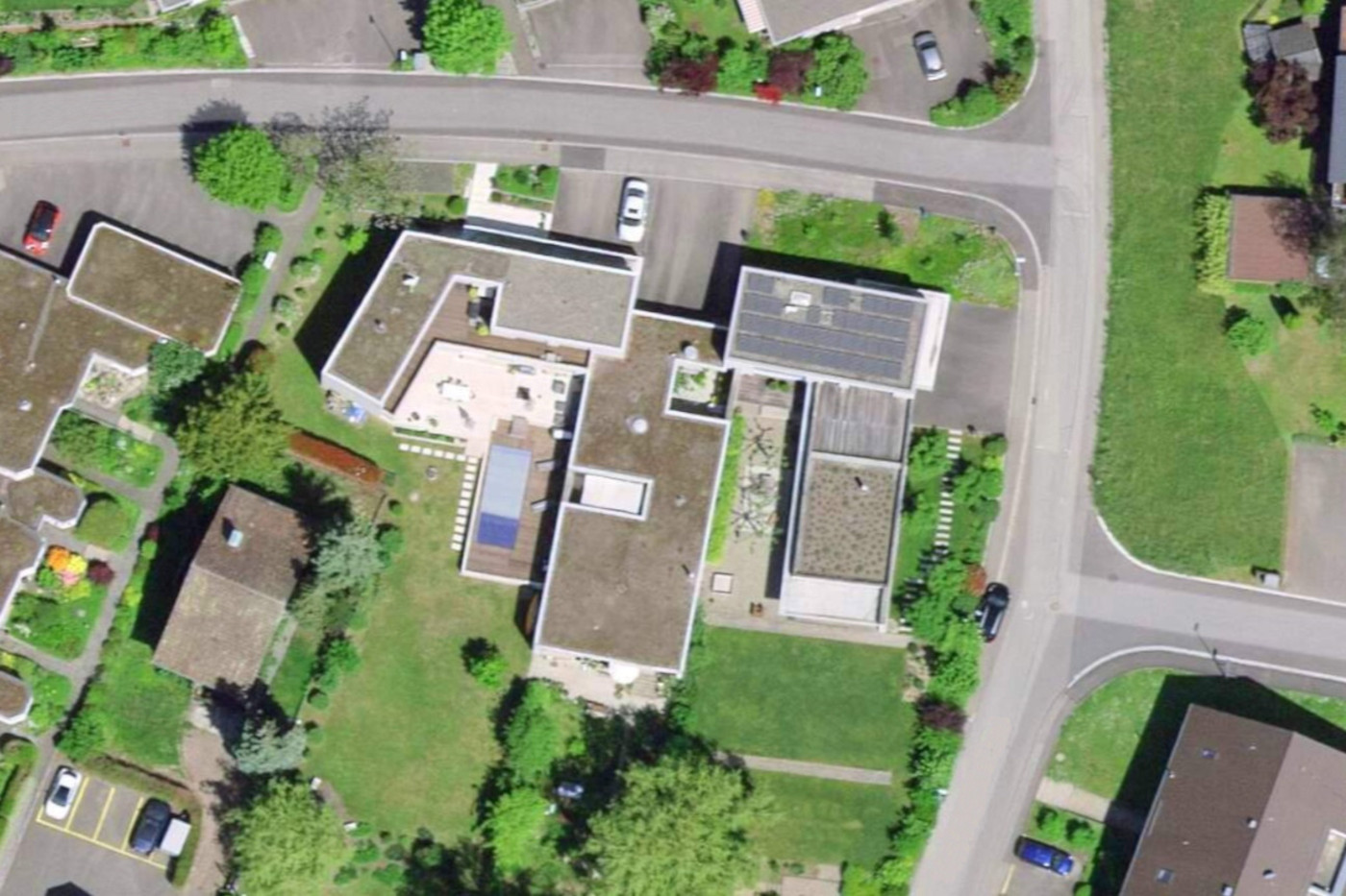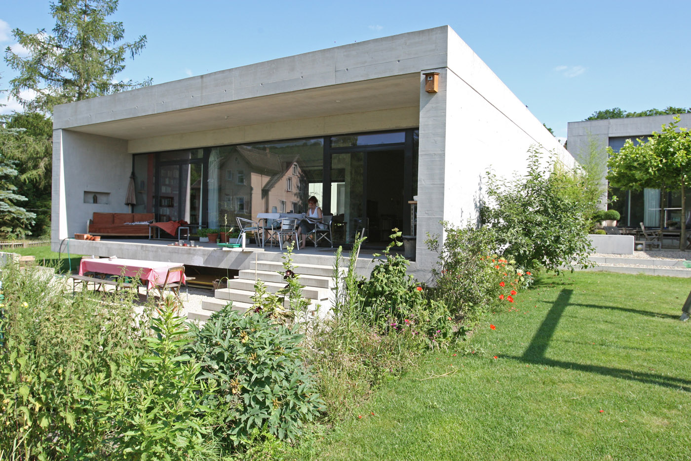 Die beiden äusseren Häuser werden L-förmig um das mittlere Haus angeordnet. Dieses ist eingeschossig konzipiert und wird zusätzlich durch 2 private Innenhöfe belichtet. Dadurch können die Seitenwände ohne Öffnungen organisiert werden und bilden die privaten Aussenräume der beiden äusseren Häuser.