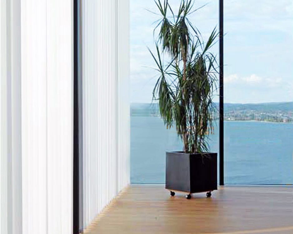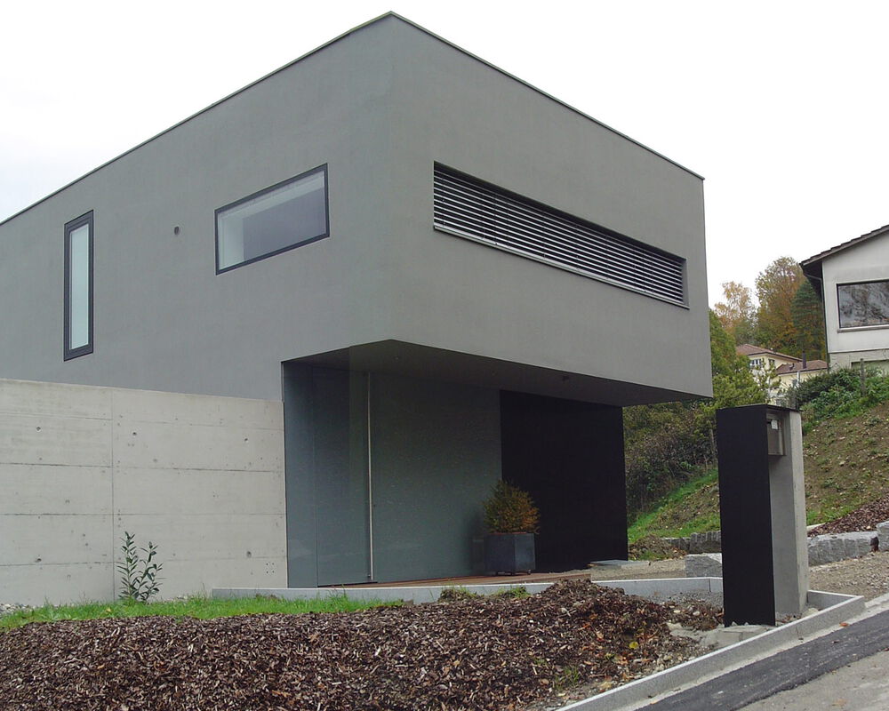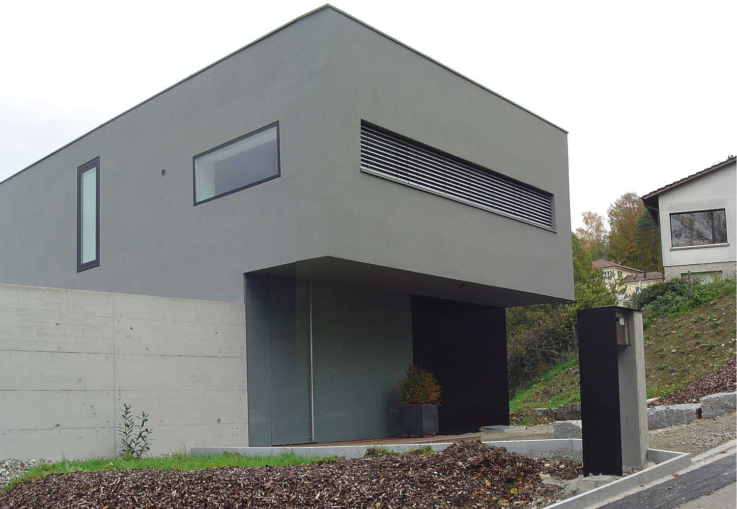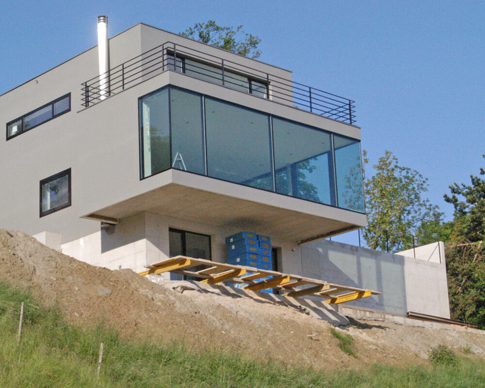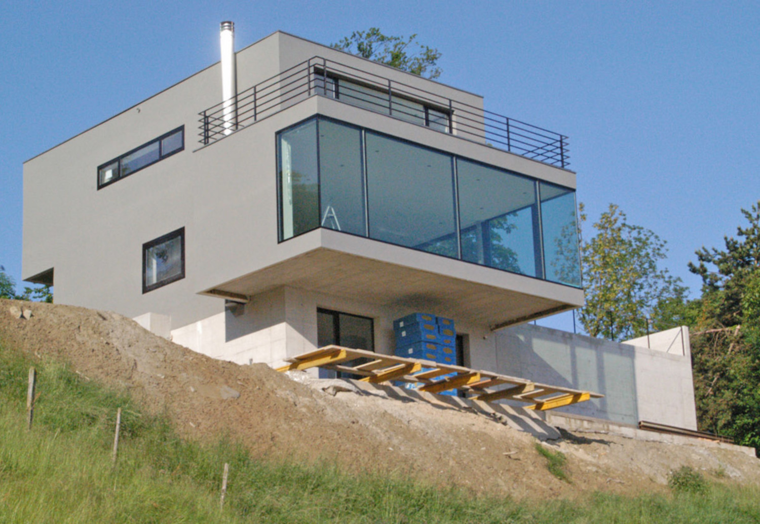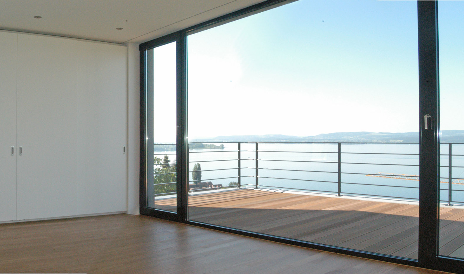 Der Baukörper liegt an einem Steilhang und nimmt mit seiner Kubatur sämtliche Innen- und Aussenräume auf. Wohnraum und Terrasse orientieren sich zum unverbauten Ausblick über den Bodensee.