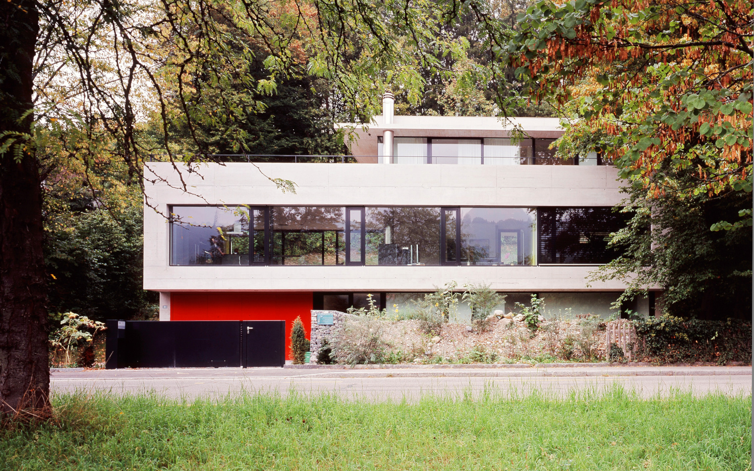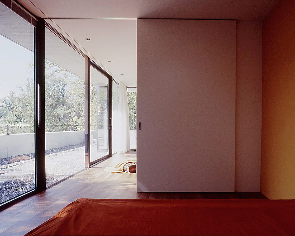 In unmittelbarer Nähe zum Rhein bietet ein zentral platzierter Wohnraum im Obergeschoss aufgrund der offenen Glasfassaden Sichtbezüge zum Wasser und Garten. Der private Elternbereich ist im zurückversetzten Dachgeschoss organisiert.