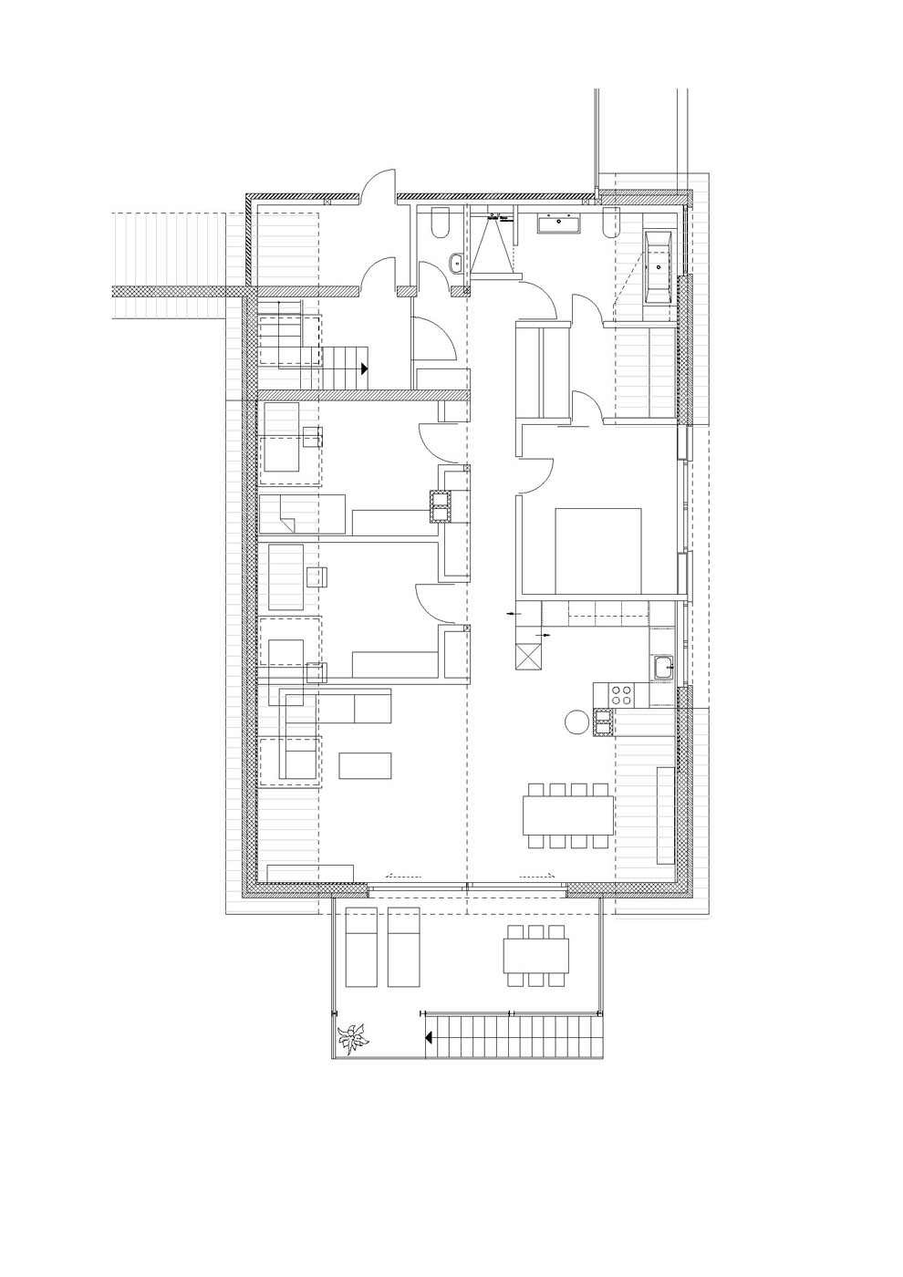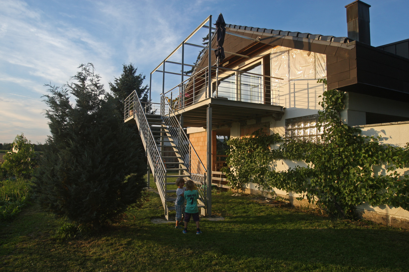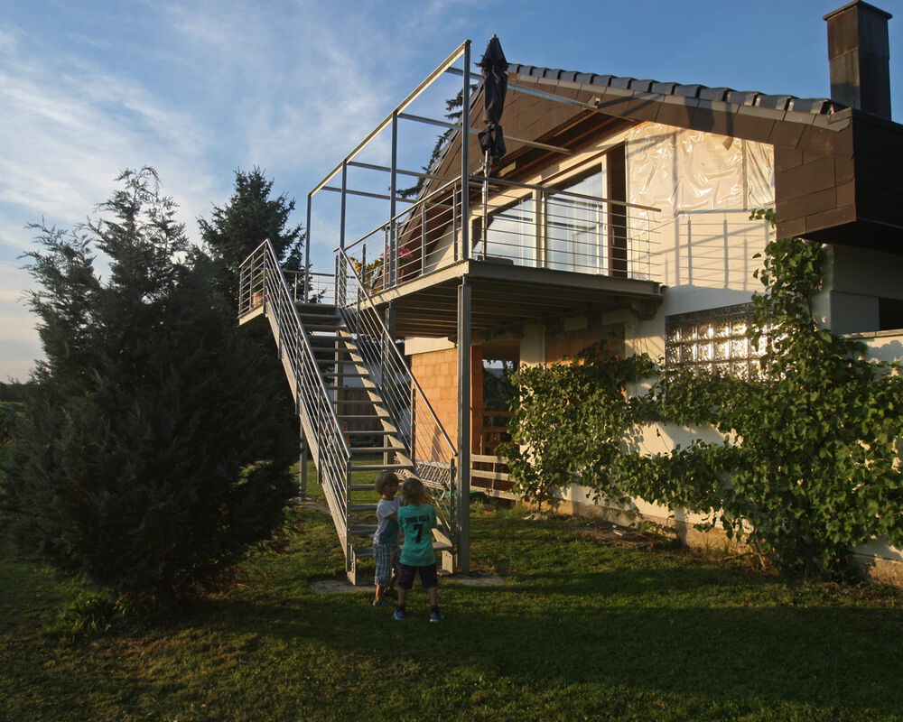 Ein bestehendes, nicht ausgebautes Dachgeschoss im landwirtschaftlichen Aussenbereich wird zu einer Wohnung umgebaut. Eine grosse, neu gesetzte Dachgaube belichtet Elternbereich und Küche. Neue Raumstrukturen werden aus statischen Gründen in Leichtbau geschaffen. Westseitig bietet ein grosszügiger Stahl-Balkon einen unverbauten Ausblick auf die offenen Felder.