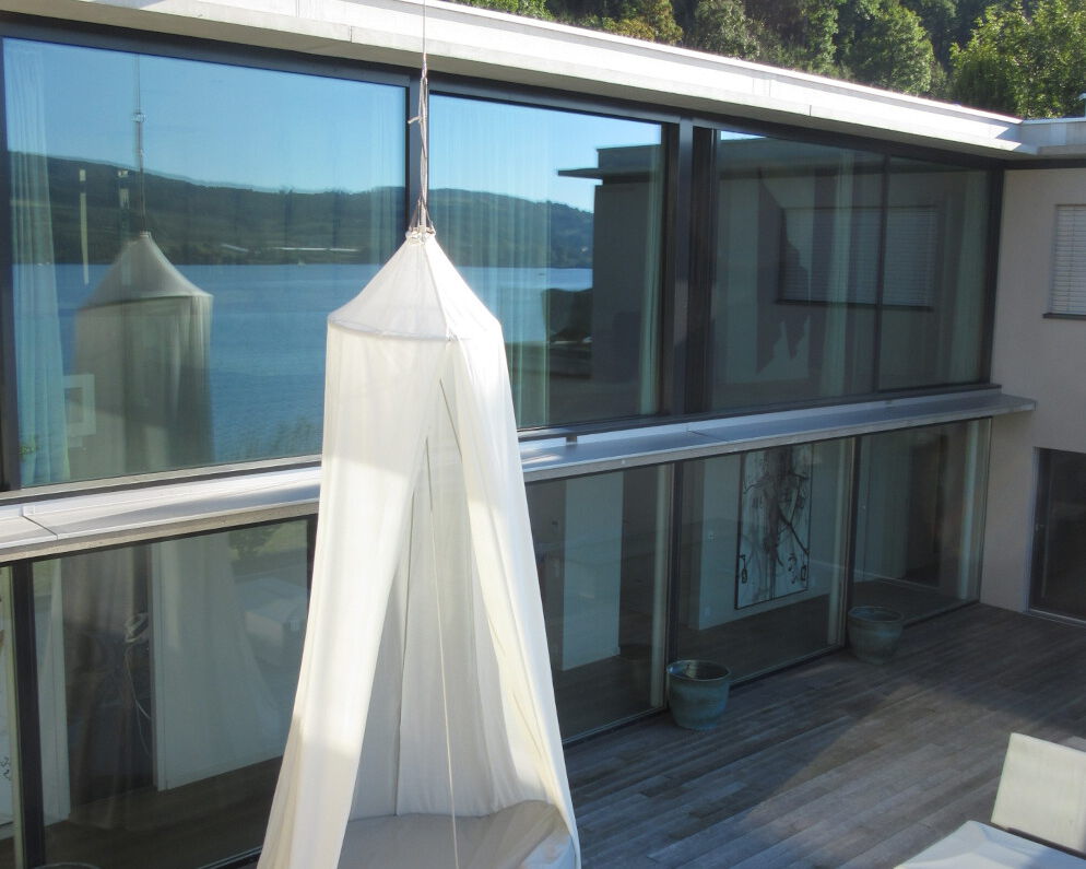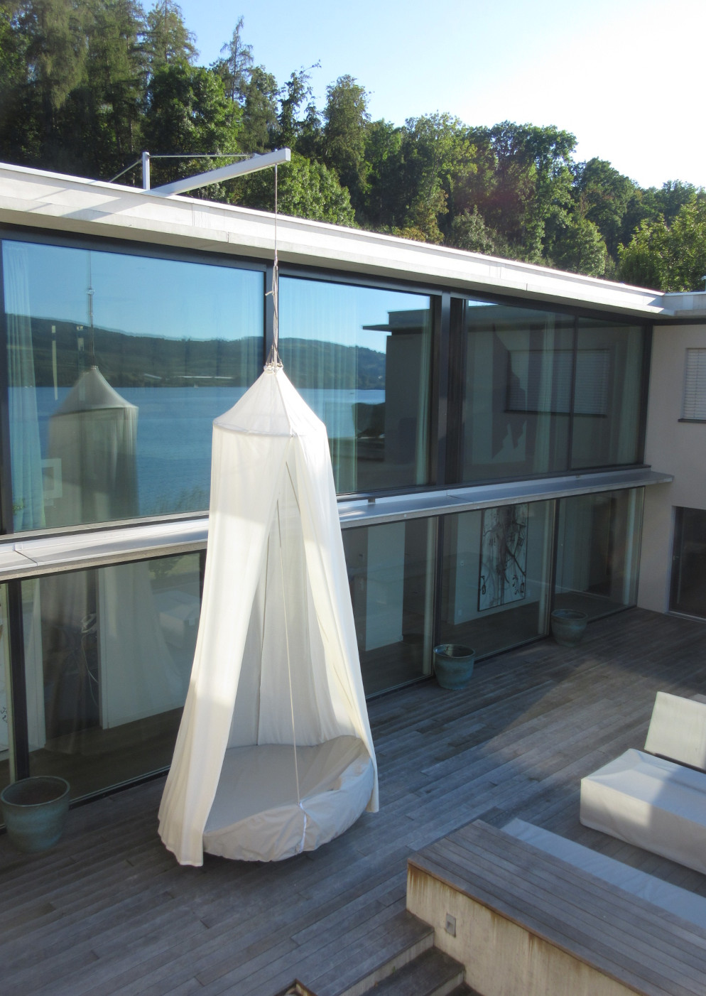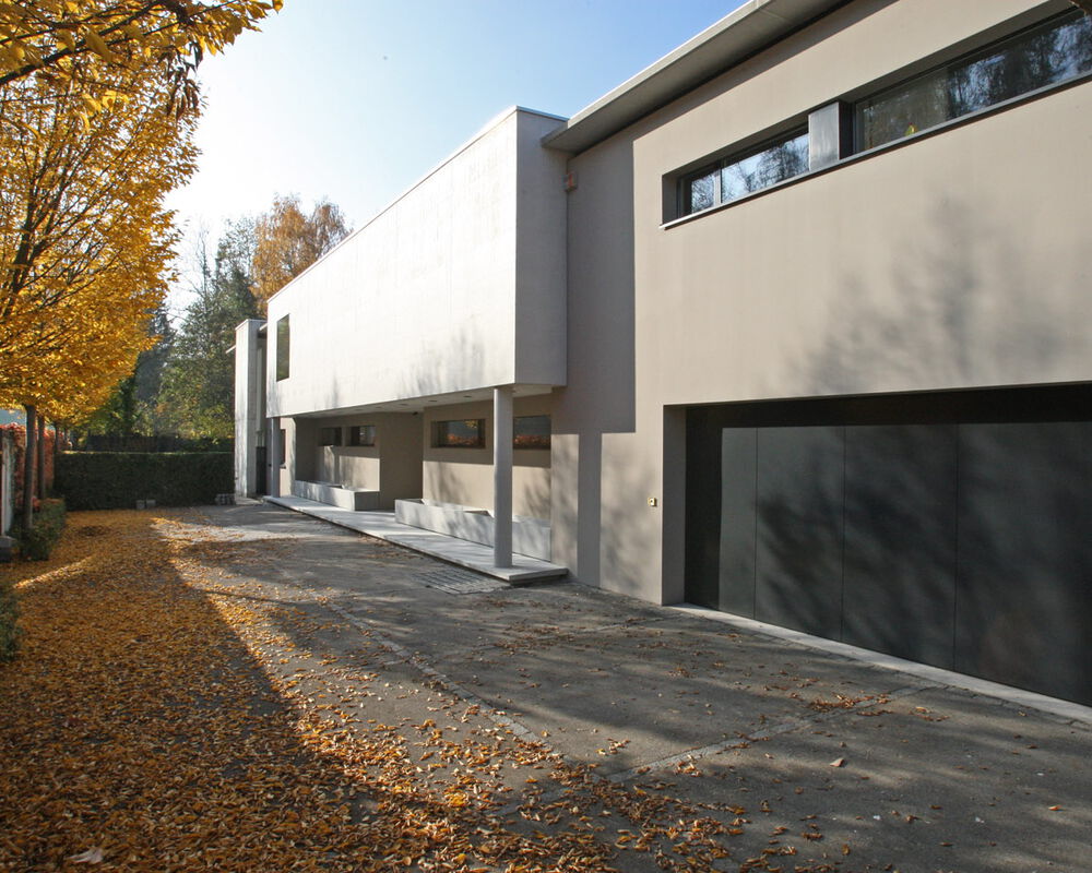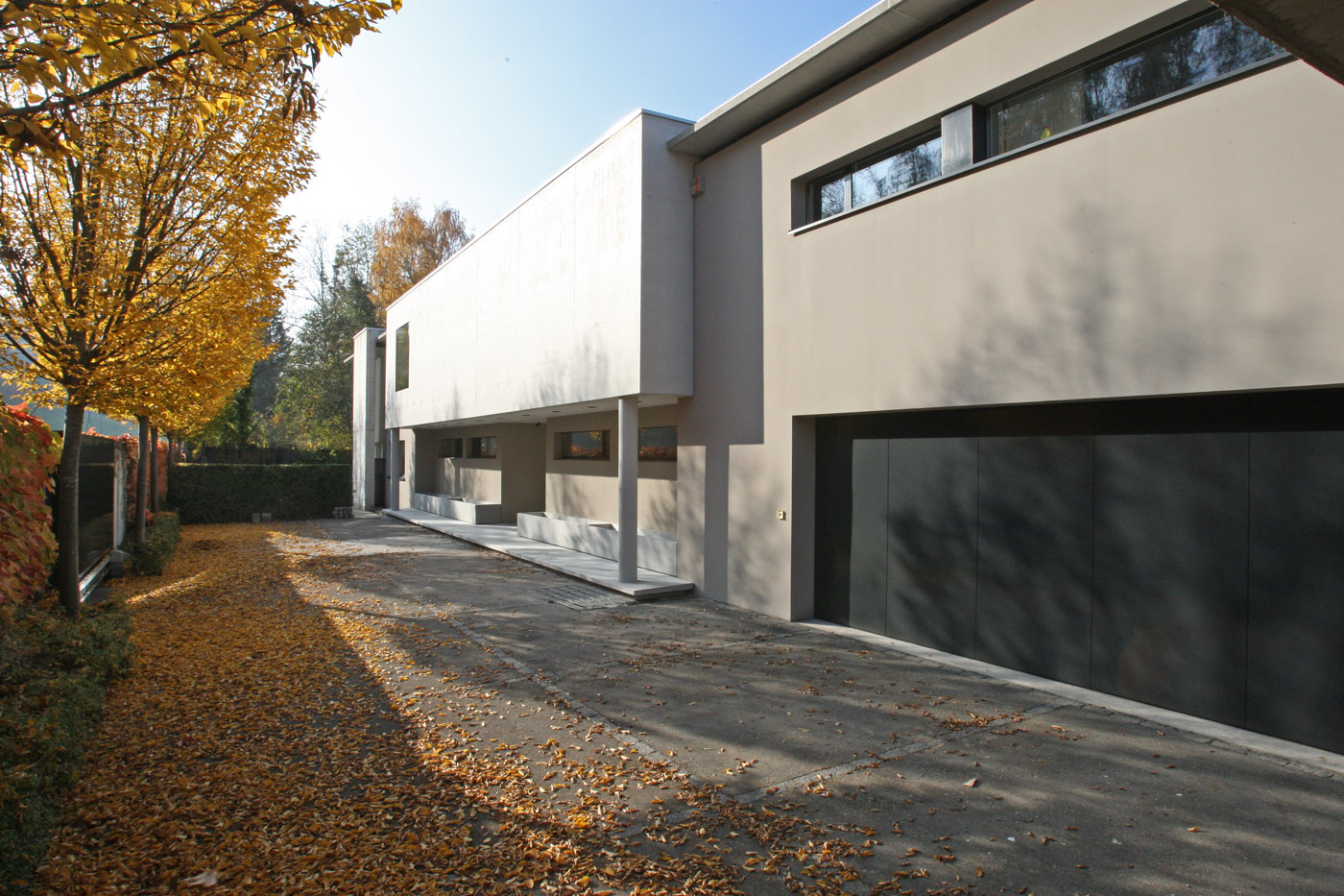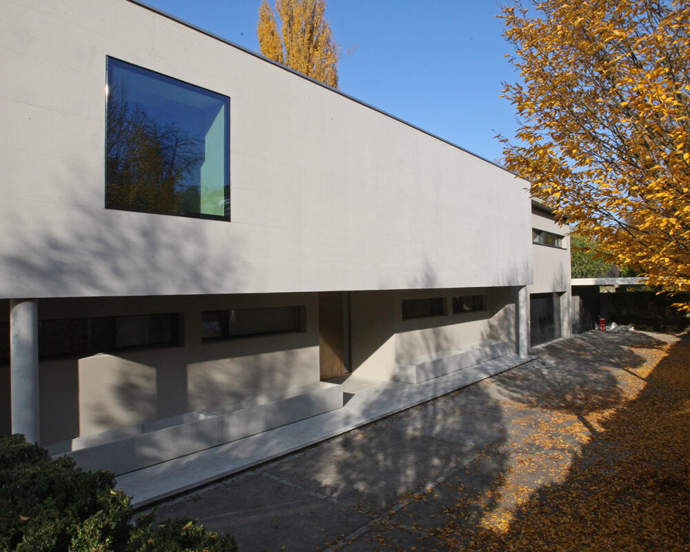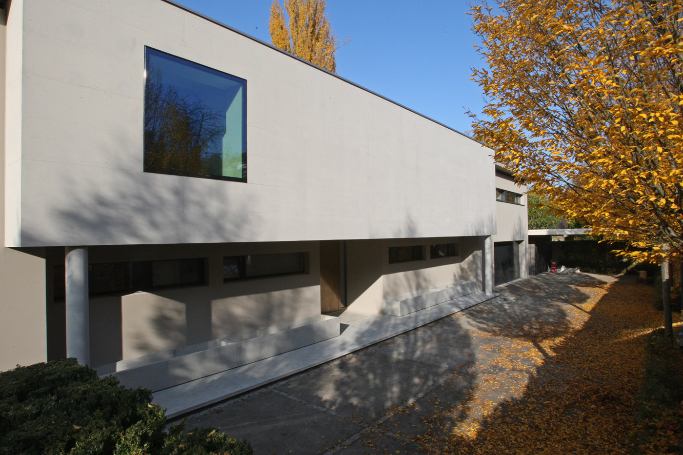 Das bestehende Haus in einzigartiger Lage wird teilweise abgebrochen und weitgehend entkernt; Raumstrukturen in EG und OG werden umfangreich verändert, um auf den Raumbedarf zu reagieren. Das OG wird durch einen Mittelbau aus Sichtbeton erweitert, dadurch kann das OG in einen Kinder- Eltern- und Gästebereich aufgeteilt werden.